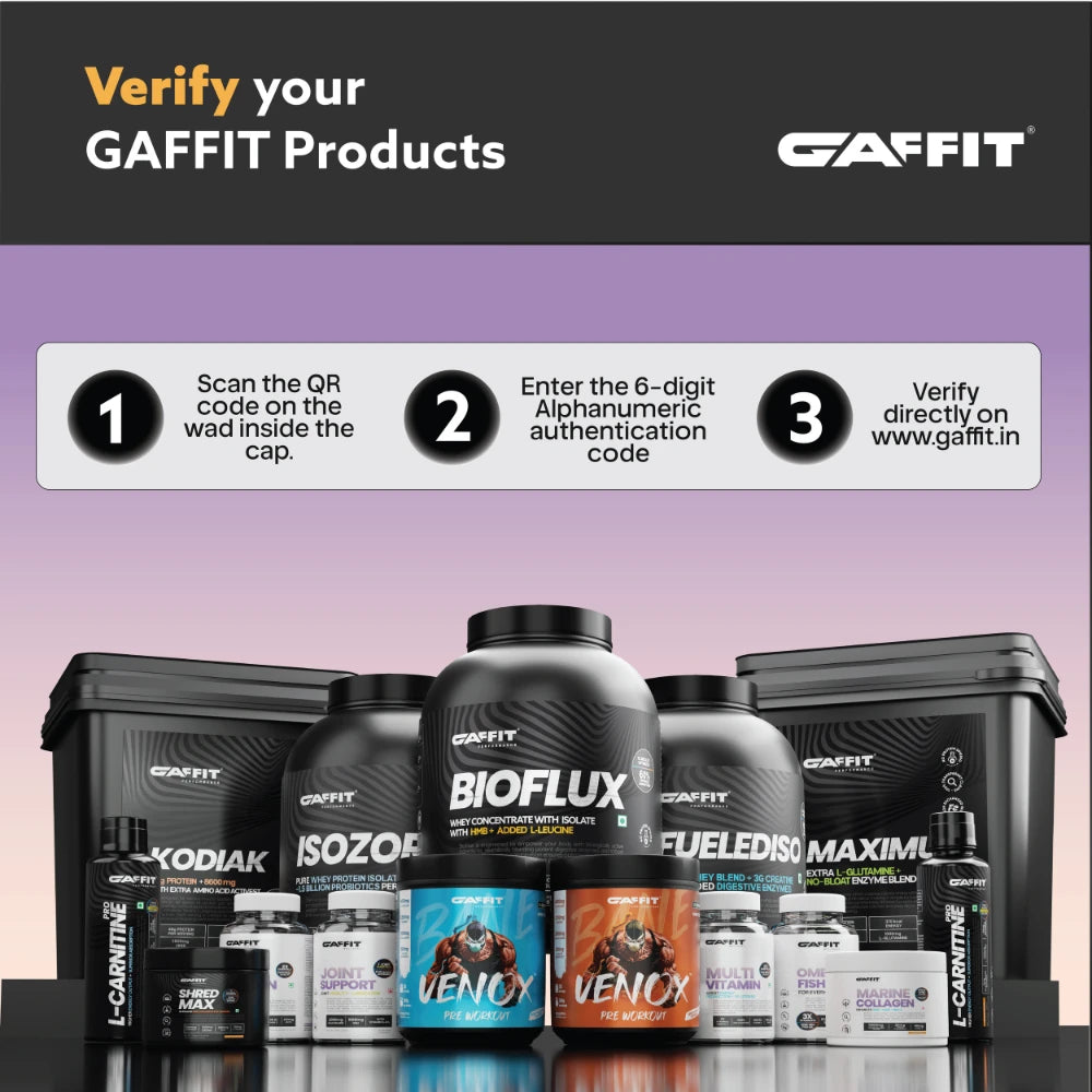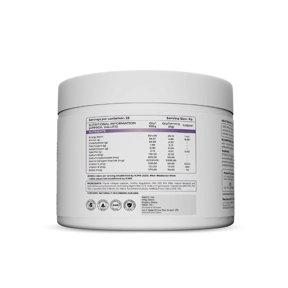 GAFFIT Marine Collagen is a daily-use wellness supplement made to support skin structure, hydration, and overall connective tissue health as natural collagen production declines with age. Each serving provides 5000mg of marine collagen peptides, predominantly Type I collagen with Type III support, which are commonly associated with skin firmness, elasticity, and tissue strength.