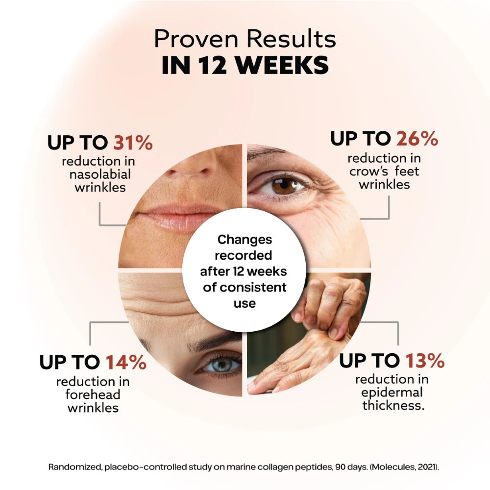 To enhance effectiveness, the formula is supported with Sodium Hyaluronate, which helps retain moisture and improve skin hydration, along with Vitamin C, a key nutrient involved in natural collagen synthesis. Vitamin E and Biotin further support skin integrity, hair strength, and nail health, making the formula more than just collagen supplementation.